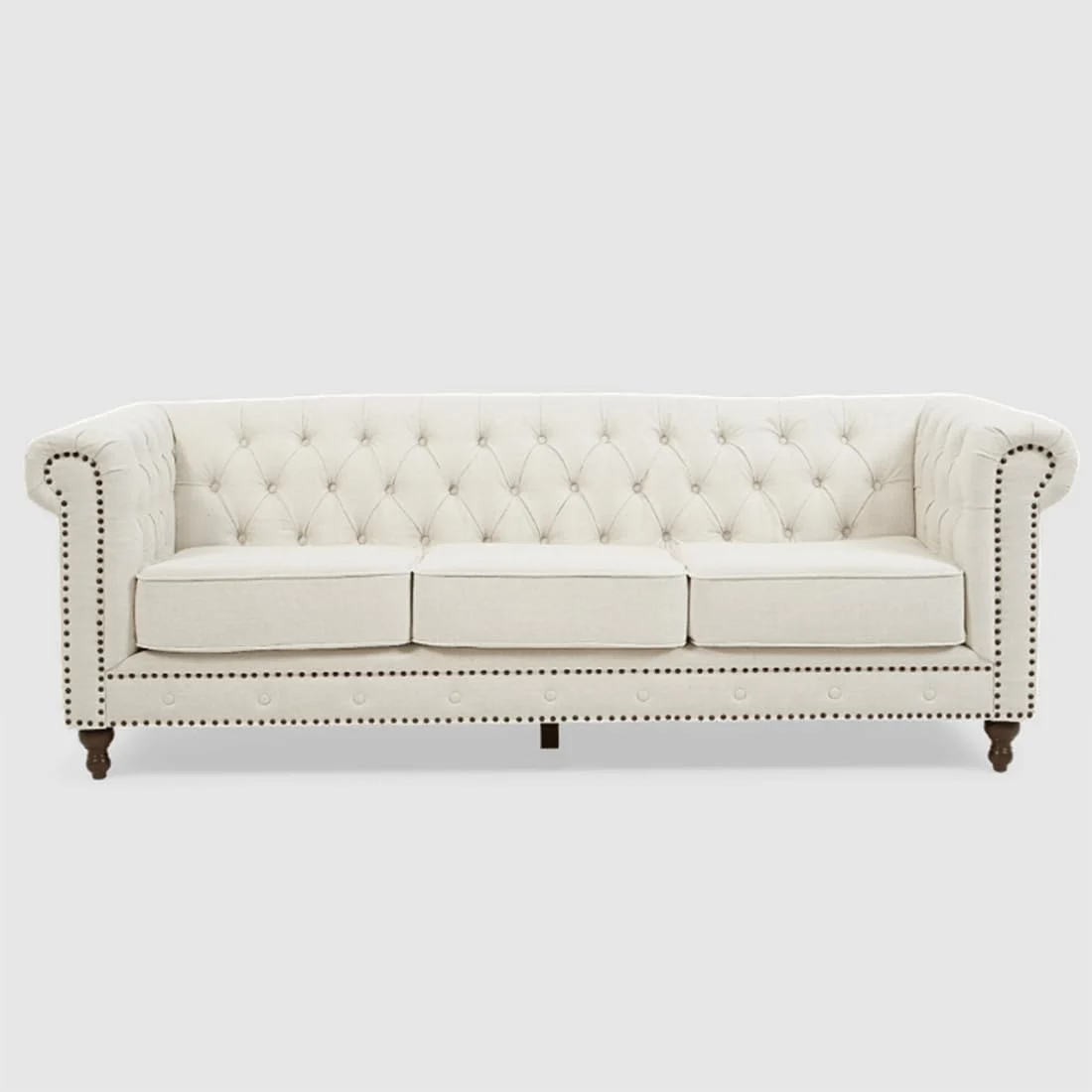 Enhance your living space with this Elegant White Chesterfield 3-Seater Sofa, designed to bring timeless sophistication and modern comfort together. Featuring deep diamond button tufting, classic rolled arms, and decorative nailhead trim, this sofa reflects iconic British-inspired design.